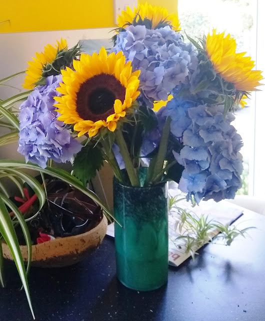 In all of the visits and socializing, I ended up with a houseful of all kinds of cut flowers... sunflowers splashy bright and elegant roses, with sweet peas and lilies spreading their perfume. So kind. A consolation in the midst of just a little grief.